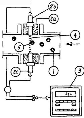 1—膠球再循環(huán)管;2—光屏;2a—連接件;2b—發(fā)射器;2c-接受器;3—微處理器(BRM-1P);4—紅外線(xiàn)光束;5—軟膠球