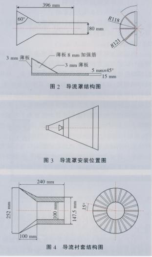 (2)在收球網距出球口900mm處加裝導流罩,通過導流罩改變了循環水流向,使循環水向收球網網板擴散,加強該區域循環水流撓動,防止膠球附著在收球網網板上。安裝前需打開收球網人孔,并使收球網處于打開狀態,然后將加工好的導流罩用筋板焊接在收球網上。導流罩結構、安裝位置和導流襯套結構見圖2、圖3、圖4所示。